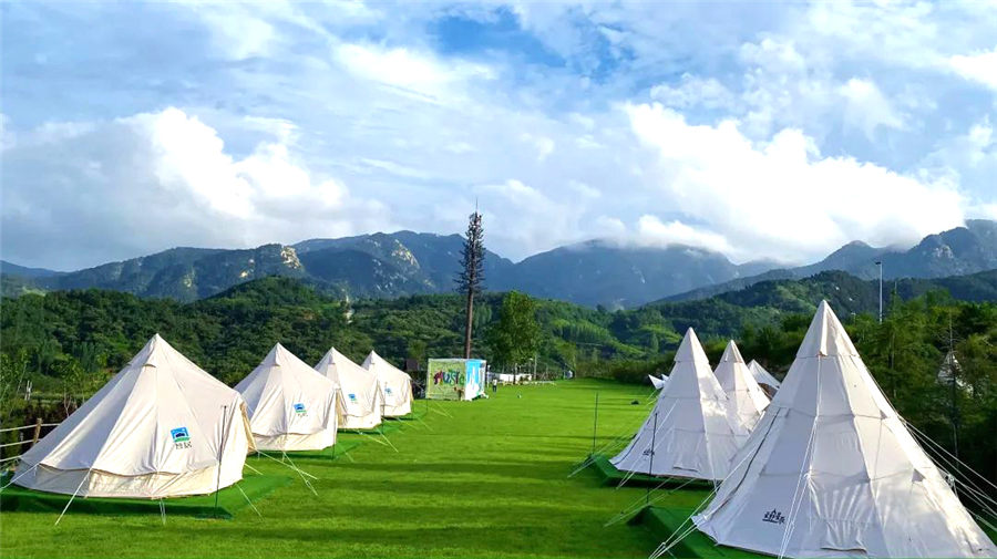 分森野帐篷区、天幕休闲区、草坪游戏区、网红打卡区、自助野炊区、洗漱区,环境静谧安逸,非常适合团建、创意求婚、生日party、朋友聚会、宴请高端客户以及家庭亲子活动。藏于山间的20余顶金字塔与印第安白色帐篷,是营地一道亮丽的风景线。在这里可品尝山野浪漫下午茶、乡野美味烤肉、夏日特制冷饮等,也有欣赏日落、飞盘运动、草坪音乐会、星空电影院、儿童游乐园、田间亲子……