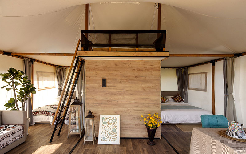 位于雪野湖北岸,占地面积12万平方米,是高端帐篷度假营地。目前,一期项目有野奢帐篷45顶,含别墅帐篷、复式帐篷、榻榻米帐篷等多种款型,配有私家花园、超大露台、泳池、按摩汤池、吊椅等休闲设施,适合家庭情侣度假、定制婚庆活动和举办高端会议等。度假村有酒吧、西餐厅、露天烧烤区、圆木剧场、书吧和SPA馆,以及园艺课堂、户外运动中心、儿童俱乐部、垂钓台、棋牌室等服务设施,并提供芬兰撞柱、不倒森林,欢乐泡泡秀、水枪大战、寻找捕捉昆虫、露天电影等休闲活动服务。