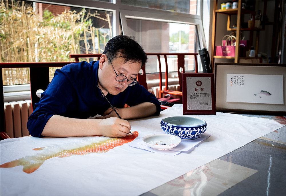 该技艺灵感源自中国古老碑拓技艺,以真实的鱼为载体,通过在鱼体上涂抹颜料,然后将鱼的形态、花纹、鳞片等拓印在纸上,最后画出鱼的眼睛。拓印出来的鱼纹理清晰、色彩艳丽、栩栩如生。鱼拓画作为渔文化的延伸,承载着人们对美好富裕生活的向往,每一幅画因其不可复制性和独特的文化艺术价值,都具有较高收藏价值。一景鱼拓画作品作为中国传统文化项目,曾入选2015年荷兰海牙博物馆展。